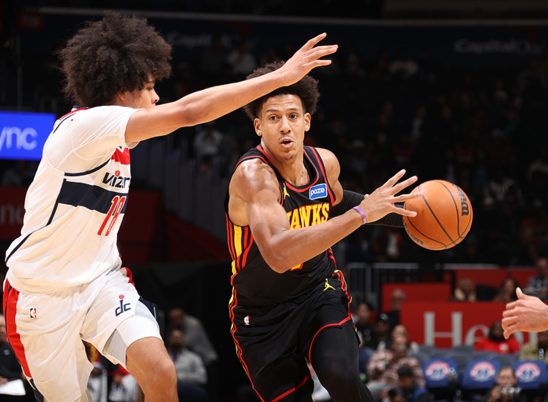 特雷杨受伤后,有个老鹰年轻人大放异彩,他就是杰伦-约翰逊,约翰逊本赛季场均能砍下23.4分10.5板7.9助1.6断0.4帽,命中率53.4%,近段时间约翰逊的表现更加惊人,11月29日打骑士他18中9(三分7中3)砍下29分12板12助2断,12月1日打76人他21中10(三分8中4)砍下41分14板7助,12月2日打活塞他17中9(三分8中4)砍下29分13板7助,12月6日打掘金他20中9(三分4中1)砍下21分18板16助2断,今日(12月7日)打奇才他18中10(三分5中2)砍下30分12板12助2断。