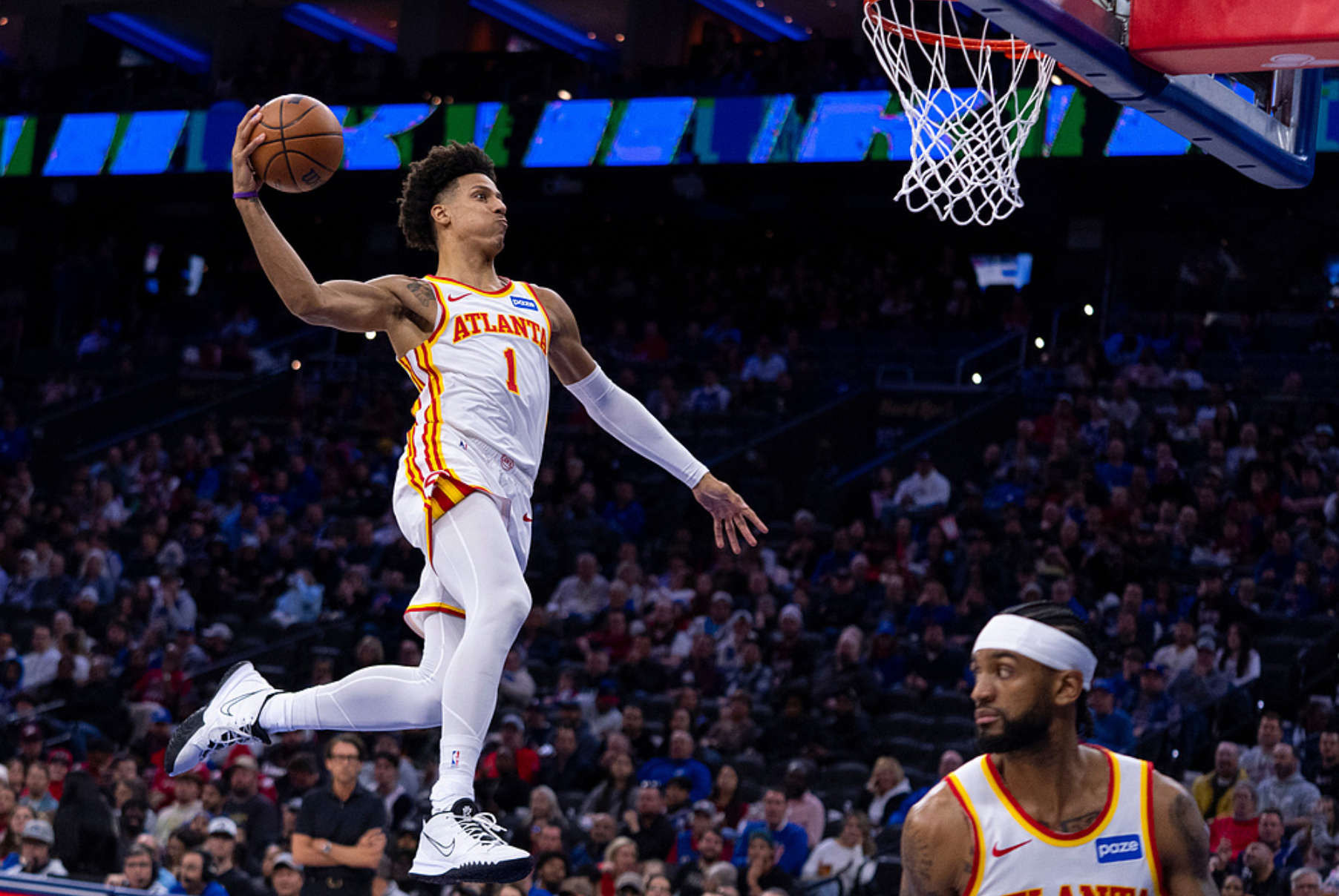 约翰逊近5场比赛场均砍下30分13.8板10.8助1.4断0.2帽,命中率50%,打出了顶级球星的表现。约翰逊是2021年第20顺位新秀,他目前还没满24岁,他身高2米03,运动能力非常出色,球商也非常高,砍下25+10+10级别数据对他而言不是难事,他的上限比特雷杨更高,防守端也不会像特雷杨那样被对手针对,老鹰可以围绕他来建队,特雷杨的大当家不保了。